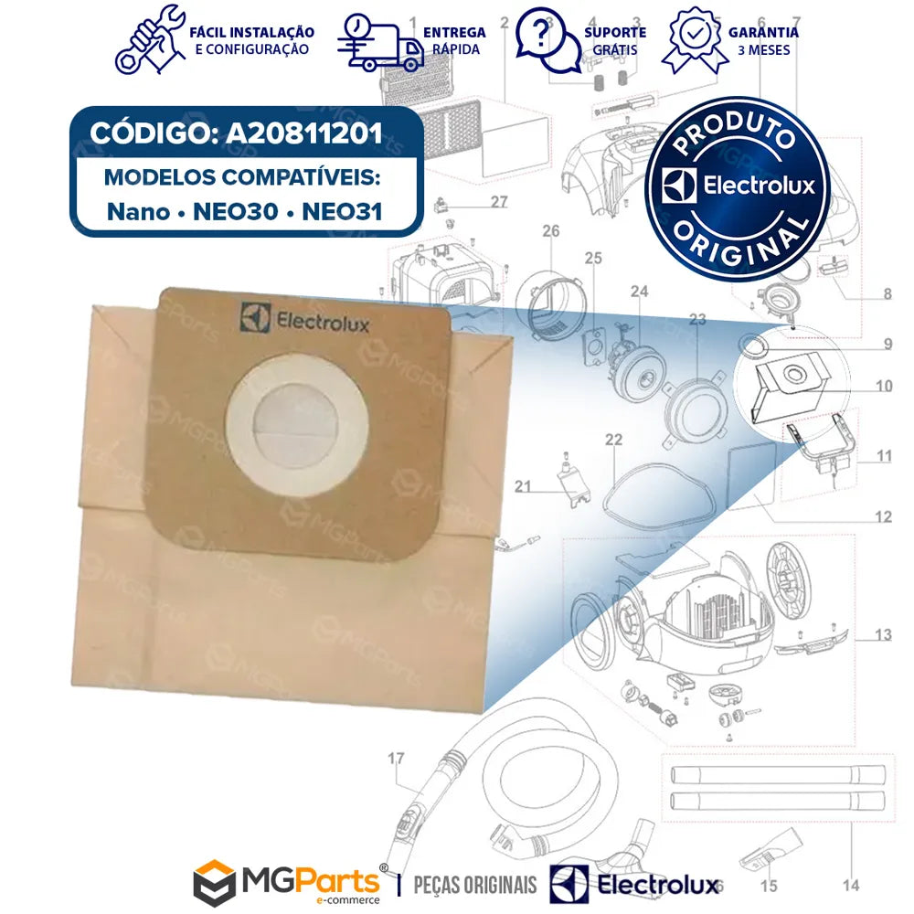 Verifique o modelo do seu aspirador e o código original da peça antes da compra. Este saco coletor é compatível apenas com os modelos NEO30 e NEO31 da Electrolux e não serve em versões antigas ou outros modelos da linha.