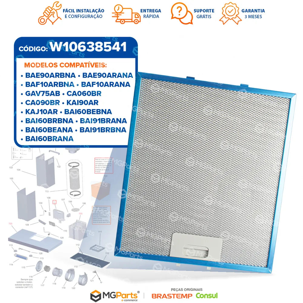 Manter o filtro em boas condições é essencial para preservar o desempenho do purificador ou coifa, evitando acúmulo de gordura interna e garantindo maior vida útil do equipamento. Na MGParts você compra com segurança, recebe nota fiscal e conta com atendimento especializado para garantir a peça correta. Garanta agora o Filtro de Alumínio Original W10638541 e mantenha sua cozinha protegida.