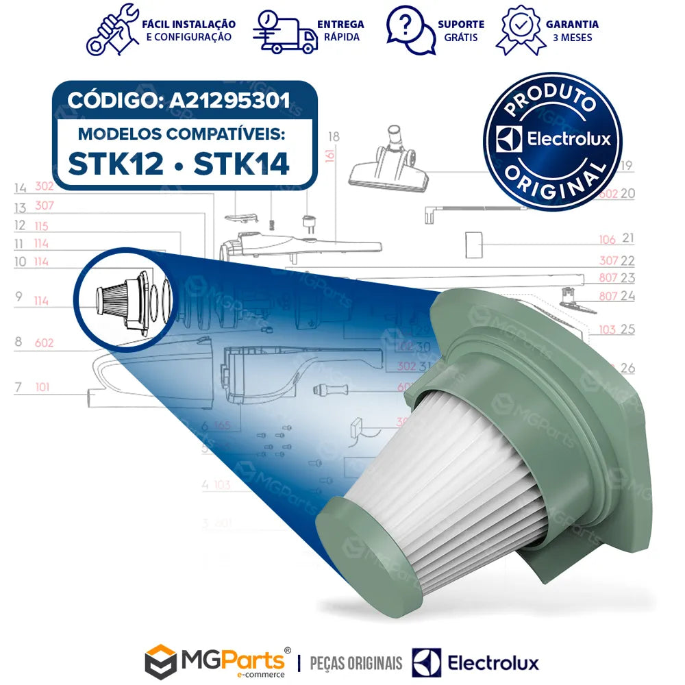 Antes de finalizar sua compra, verifique o modelo exato do seu aspirador. Este filtro é compatível apenas com as versões STK12 e STK14 da linha Powerspeed. Sempre confirme o número da peça (A21295301) e a referência de engenharia do produto original.