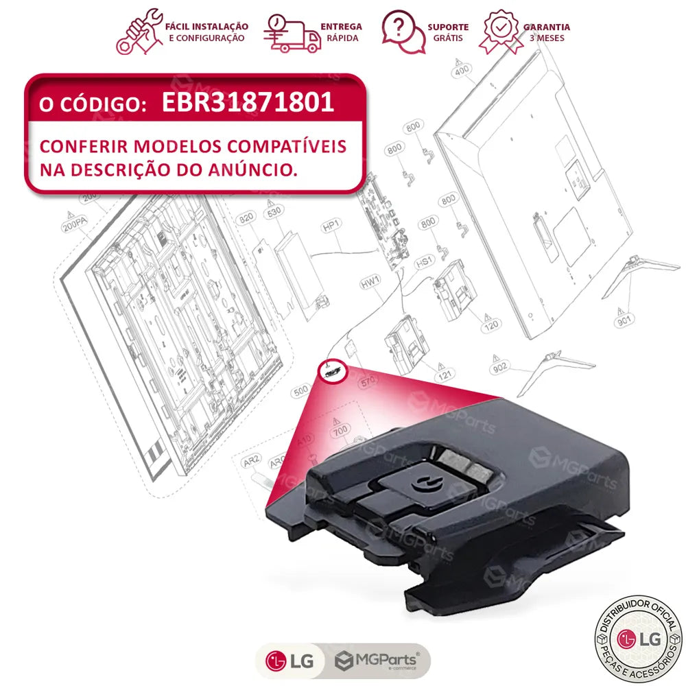 Verifique o código EBR31871801 impresso na sua peça original antes de efetuar a compra. Apesar de atender diversos modelos de televisores LG, é importante confirmar a compatibilidade exata com sua TV para evitar incompatibilidades de conector ou montagem.