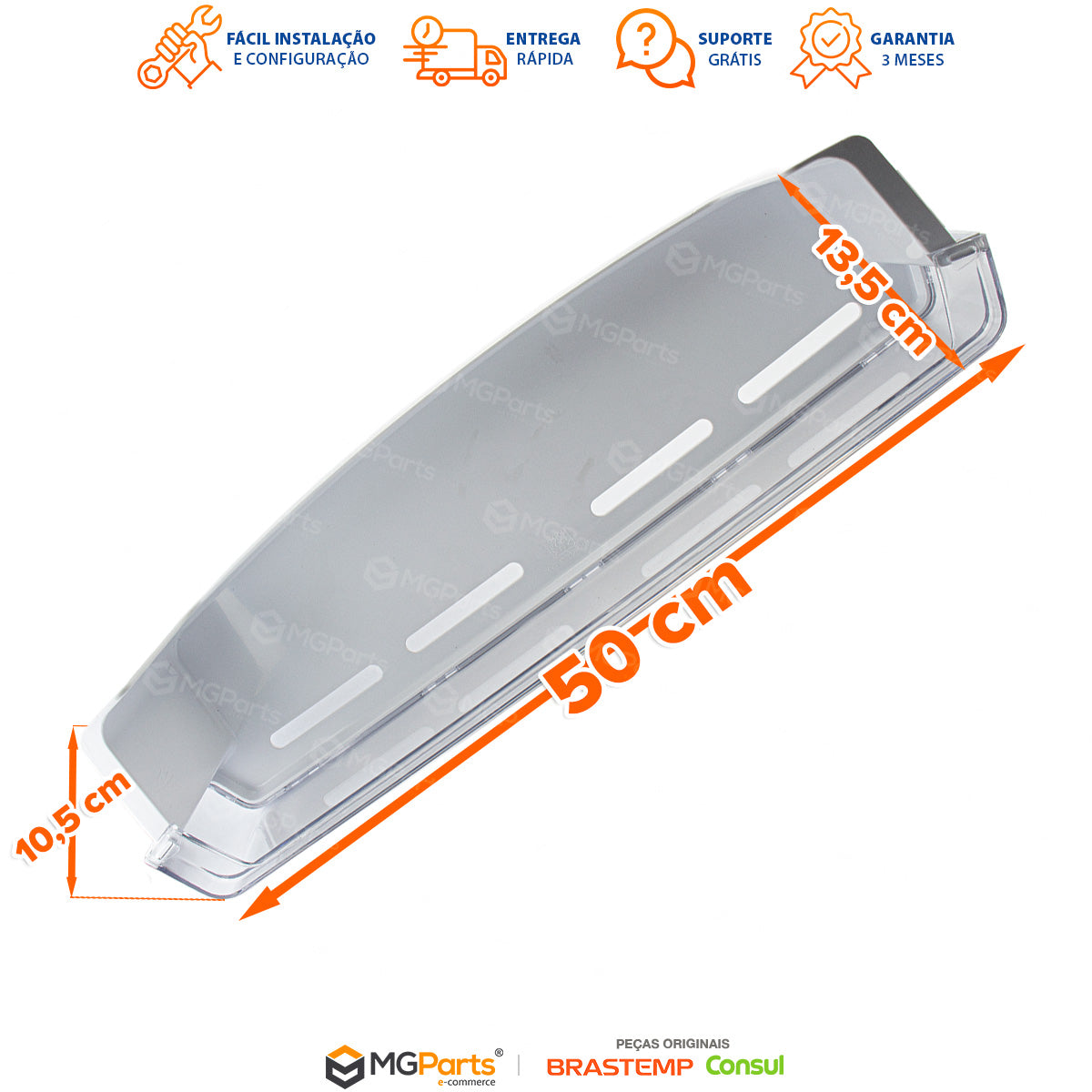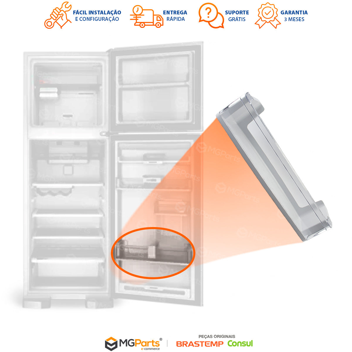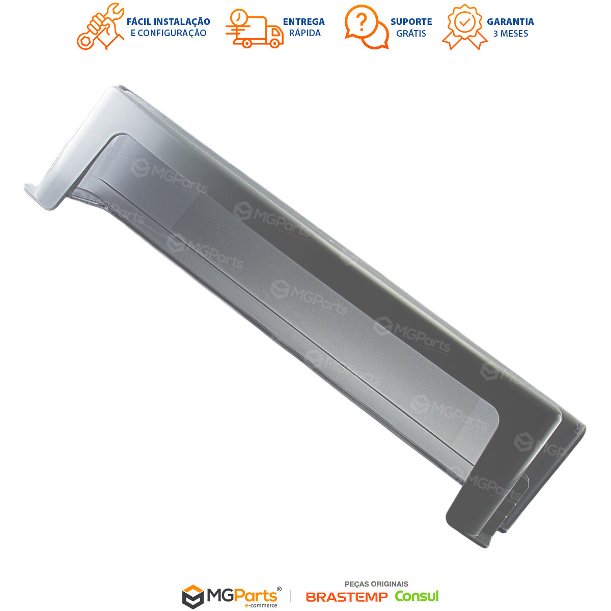 Confirme o modelo completo da sua geladeira na etiqueta interna do produto. A utilização de peça incorreta pode gerar folgas ou incompatibilidade no encaixe. Em caso de dúvida, informe o modelo à equipe da MGParts para validação antes do envio.
