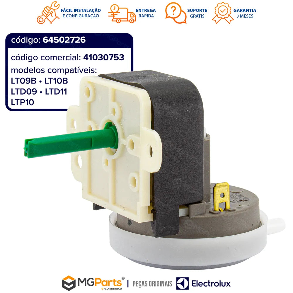 Verifique atentamente o código da peça (64502726) e o modelo da sua lavadora antes da compra, pois o uso de pressostatos incorretos pode comprometer o funcionamento do equipamento.