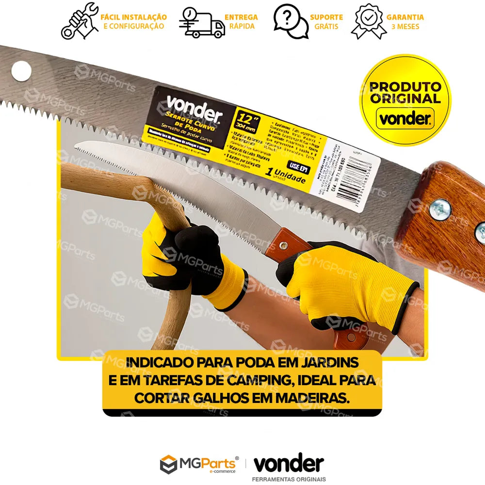 Seu jardim ou área verde está precisando de uma poda eficiente? O serrote curvo de poda Vonder 12” é a ferramenta ideal para quem busca desempenho, conforto e durabilidade em cada corte. Fabricado com lâmina em aço temperado e cabo de madeira ergonômico, garante excelente precisão em podas de galhos verdes, secos ou úmidos, tornando o trabalho mais rápido e seguro. Ao comprar com a MGParts, você tem a certeza de adquirir um produto original Vonder, com nota fiscal, envio imediato e suporte técnico especializado.
